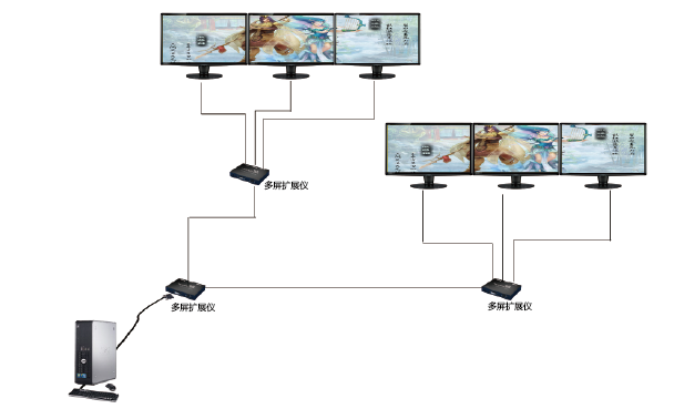 多屏擴(kuò)展儀具備靈活的級(jí)聯(lián)能力,可以在具備相同計(jì)算機(jī)輸出接口的情況下將可以連接的顯示...