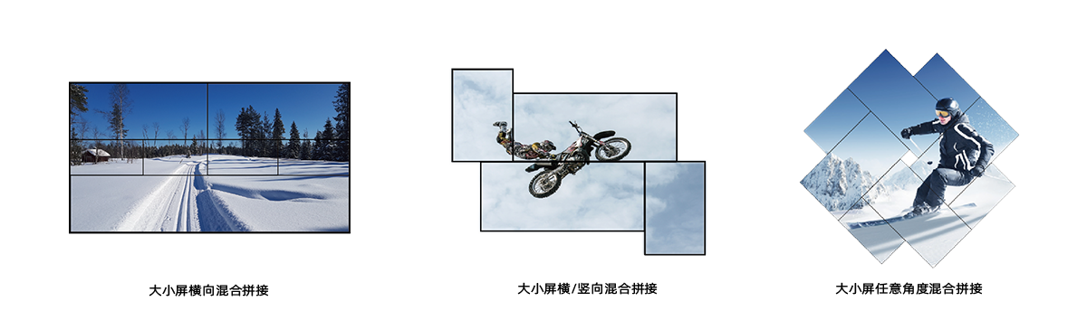 支持任意角度(0-360)旋轉(zhuǎn)和任意間距創(chuàng)意拼接,支持大小屏混合拼接,支持LED/LCD/投影混合拼接